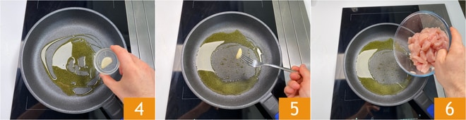 Em uma panela, aqueça o óleo aromatizando-o com o alho 4, quando estiver bem quente retire o alho 5 e adicione as tiras de frango 6.