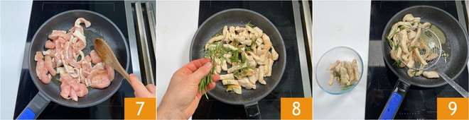 Doure em fogo alto, mexendo com frequência 7 e adicione as folhas de alecrim 8. Quando estiverem bem douradas, reserve 9.