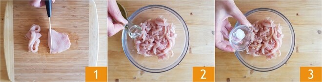 Para preparar as tirinhas de frango ao curry, primeiro corte o frango em tiras 1, coloque em uma tigela grande, adicione o óleo 2 e sal 3.
