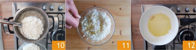 Assim que o arroz estiver pronto, retire da água de cozimento com uma escumadeira 10 e coloque para esfriar em uma tigela. Tempere depois com sal e óleo 11. Aqueça um pouco de óleo em uma frigideira grande, adicione o dente de alho esmagado 12, doure por alguns minutos, aromatizando assim o óleo.