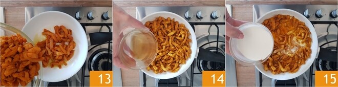 Retire o alho, adicione o frango 13 e deixe dourar em fogo moderado por cerca de 8 minutos, mexendo sempre. Assim que o frango estiver dourado de todos os lados, adicione uma pitada de pimenta-do-reino, misture e adicione o caldo quente 14 e o creme de leite 15.