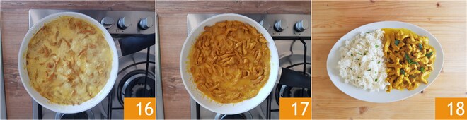 Cozinhe por mais 10 minutos 16, mexendo de vez em quando até o molho engrossar 17. Desligue o fogo e deixe esfriar um pouco. Emprate e sirva o frango acompanhado do arroz, decore o prato com folhas de salsa. As tirinhas de frango ao curry estão prontas para serem saboreadas 18.