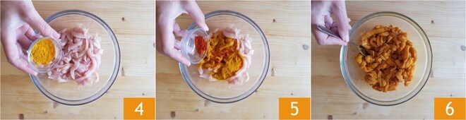 Tempere com o curry 4 e a páprica 5, misture com uma colher 6 para cobrir todo o frango com as especiarias. Deixe descansar por 15 minutos.