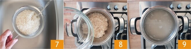 Enquanto isso, prepare o arroz. Enxágue o arroz 7 e coloque em uma panela, cubra com água 8 e cozinhe por 10 minutos após a fervura 9.