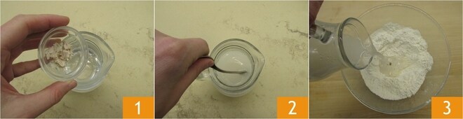 Para preparar as tirinhas de pizza frita, a primeira coisa a fazer é dissolver o fermento em metade da quantidade de água indicada 1. Misture bem para dissolvê-lo 2 e despeje em uma tigela grande, onde você já terá colocado a farinha 3.