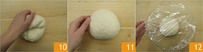 Quando obtiver uma consistência bem lisa 10, forme uma bola 11 e transfira-a para uma tigela. Cubra com filme plástico 12 e deixe crescer por 6 horas à temperatura ambiente.