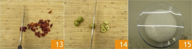 Passado esse tempo, pique os tomates secos 13 e corte as azeitonas em rodelas 14. Retome a massa que terá dobrado de volume 15.