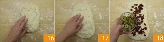 Transfira para uma superfície 16 e aperte-a com as mãos para tirar o ar 17. Adicione os tomates secos e as azeitonas 18.