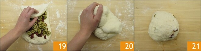 Feche a massa para incorporá-los 19 e amasse rapidamente 20 até obter uma massa homogênea 21.