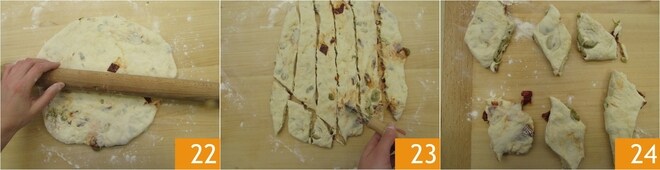 Estenda a massa com um rolo 22 e, utilizando uma roda de corte, faça primeiro tiras verticais e depois algumas oblíquas 23, para obter losangos 24.