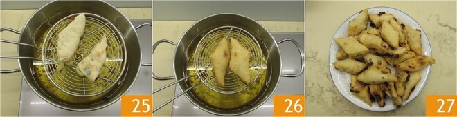 Aqueça bem o óleo e mergulhe poucos pedaços de cada vez, ajudando-se com uma escumadeira 25, frite até ficarem bem dourados. Escorra-os 26, coloque sobre papel absorvente, adicione uma pitada de sal e sirva suas tirinhas de pizza frita 27.