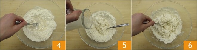 Comece a misturar com um garfo 4, depois adicione a água restante 5 e misture novamente 6.