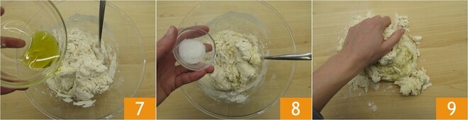 Adicione o óleo 7 e, por último, o sal 8. Continue misturando na tigela, depois transfira para uma superfície e continue amassando 9.