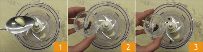 Para preparar o tomahawk grelhado, primeiro retire a carne da geladeira e deixe-a em temperatura ambiente por pelo menos uma hora. Prepare o sal aromatizado: coloque os dentes de alho descascados em um processador 1 junto com as bagas de zimbro 2 e os grãos de pimenta 3.