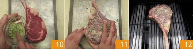 Massageie a carne com o sal aromatizado 10 para temperá-la bem de todos os lados 11. Agora prossiga com o cozimento: coloque o bife na grelha bem quente e sele por 10 minutos, certificando-se de que a chama não esteja muito forte 12.