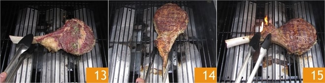 Decorridos 10 minutos, use uma pinça para virar a carne perpendicularmente à grelha e sele desta forma por mais 5 minutos 13. Neste ponto, vire-a do outro lado e deixe cozinhar por mais 10 minutos 14, depois posicione-a perpendicularmente do outro lado e sele por mais 5 minutos. A temperatura interna deve atingir 55°-60°.