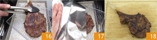 Uma vez cozida, transfira o bife para uma grelha que você terá posicionado sobre uma assadeira 15, cubra com uma folha de papel alumínio 16 e deixe descansar em um local quente por cerca de 10 minutos. Desta forma, a carne aquecerá uniformemente e os sucos se distribuirão internamente. Seu tomahawk grelhado está pronto para ser apreciado 18!