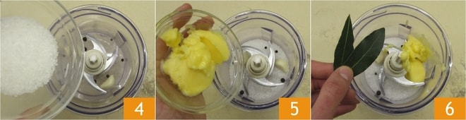 Adicione o sal grosso 4, a manteiga clarificada 5 e as folhas de louro 6.