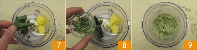 Finalmente, adicione a sálvia 7 e o alecrim 8 e misture até obter uma mistura homogênea 9.