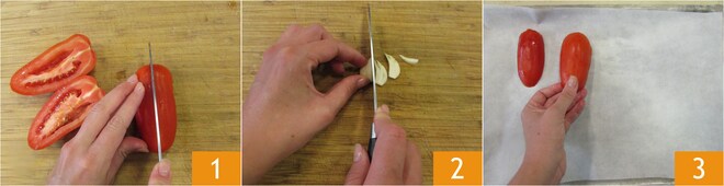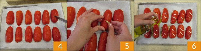 Faça cortes nas costas dos tomates 4 e insira neles fatias de alho 5. Regue com um fio de azeite 6.