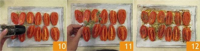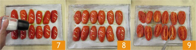 Polvilhe com uma pitada de sal 7 e asse em forno pré-aquecido a 180° por 20 minutos. Retire os tomates do forno 8 e vire-os um a um 9.