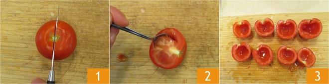 Para preparar os tomates gratinados, lave os tomates, corte-os ao meio 1, extraia a polpa que você usará para o recheio e reserve as metades esvaziadas 3.