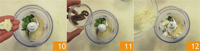 Adicione o dente de alho descascado e cortado ao meio (você pode remover o miolo antes de usá-lo) 10, as anchovas escorridas do óleo de conservação 11 e o queijo ralado 12. Tempere com uma pitada de sal, não exagere nesta fase devido à presença do queijo ralado.