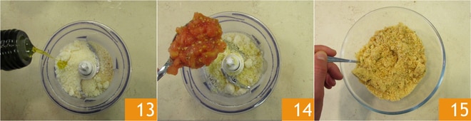 Por fim, adicione o azeite 13 e a polpa dos tomates escorrida 14, triture tudo no processador até obter uma farofa homogênea 15.