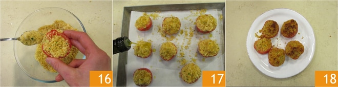 Preencha cada metade de tomate com o recheio obtido 16, disponha os tomates em uma assadeira forrada com papel manteiga, regue levemente os tomates com azeite 17. Asse em forno ventilado a 200°C por 10-12 minutos, ou até dourar. Sirva os tomates gratinados quentes 18.