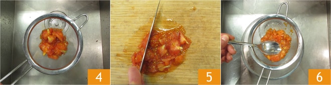 Escorra a polpa da água em excesso 4, depois pique-a com uma faca 5, em seguida escorra novamente para eliminar o excesso de água 6.