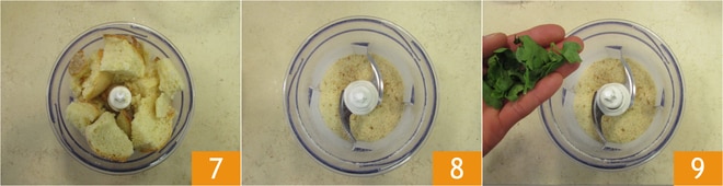 Corte grosseiramente o pão amanhecido 7 antes de triturá-lo no processador 8. Adicione a salsinha 9.