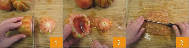 Para preparar os tomates recheados com carne, primeiro lave os tomates, corte a tampa superior com cerca de 2 cm de espessura 1 e reserve-as. Retire o interior dos tomates com a ajuda de uma colherzinha 2 e pique finamente a polpa retirada 3.