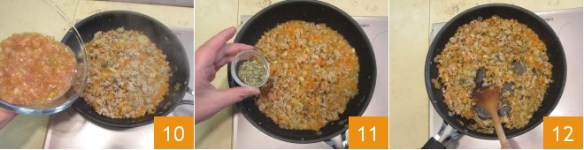 em seguida, acrescente a polpa de tomate picada 10, abaixe o fogo e deixe cozinhar por 5-6 minutos. Por fim, aromatize com orégano 11, tempere com sal e pimenta e desligue o fogo 12.