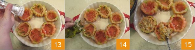 Coloque os tomates vazios em uma travessa, salgue o interior 13 e tempere com um fio de azeite 14. Recheie os tomates com o recheio de carne até a borda 15,