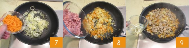 Agora pegue uma frigideira antiaderente, coloque cerca de 30 g de óleo retirados da quantidade total e adicione o alho-poró e as cenouras 7. Refogue em fogo médio-alto por cerca de 4-5 minutos, depois junte a carne moída 8 e deixe dourar por cerca de 3 minutos. A seguir, acrescente o vinho branco 9 e deixe-o evaporar completamente,