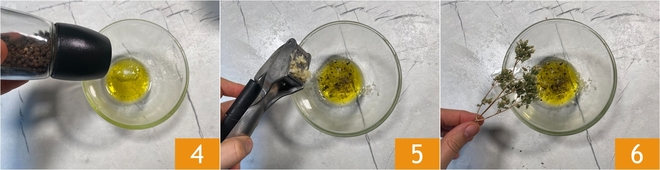 Adicione uma pitada de pimenta preta 4, o dente de alho amassado 5 e o orégano 6.