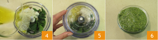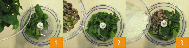 Para preparar o tomino no churrasco com vegetais grelhados e mostarda, primeiro prepare o pesto: lave e seque as folhas de manjericão e hortelã, depois coloque-as em um mixer 1 junto com os pistaches 2 e o Parmesão ralado 3.
