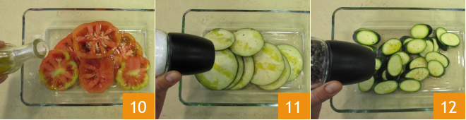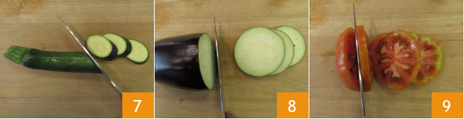 Corte as abobrinhas 7, a berinjela 8 e o tomate em fatias de cerca de 8 mm de espessura 9.