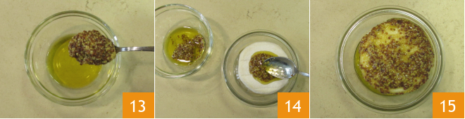 Em uma tigelinha, misture a mostarda com o azeite de oliva 13 e mexa bem para emulsionar. Cubra os tominos com a mistura obtida 14 e deixe-os marinar por pelo menos 30 minutos, ou melhor, durante toda a noite; neste caso, coloque-os na geladeira, caso contrário, deixe-os em temperatura ambiente.