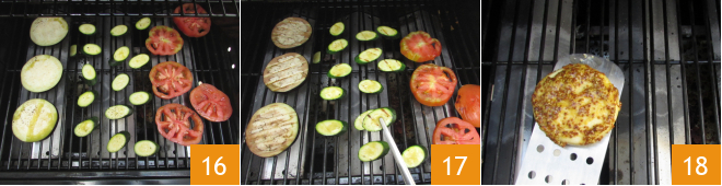 Após o tempo de marinada, você pode prosseguir com o cozimento: coloque os vegetais na grelha 16, feche com a tampa e grelhe-os de ambos os lados 17. Cozinhe as abobrinhas e as berinjelas por um total de cerca de 10 minutos, enquanto os tomates devem cozinhar por alguns minutos a menos. Uma vez prontos, transfira os vegetais para a grelha superior e coloque os tominos na inferior 18. Cozinhe os tominos por 1-2 minutos de cada lado, até que pareçam prestes a explodir.