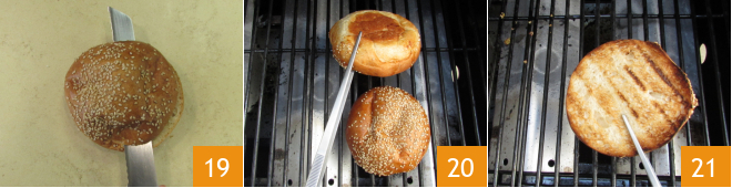 Enquanto isso, divida os pães ao meio 19 e coloque-os na grelha com o lado cortado voltado para baixo 20 até ficarem levemente tostados 21.