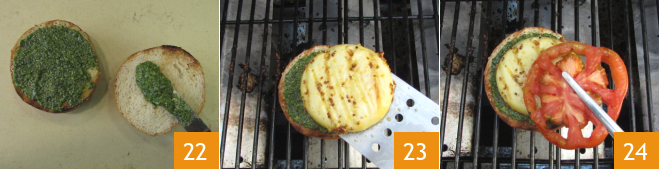 Espalhe o pesto preparado anteriormente em ambos os lados do pão 22 e coloque a metade inferior de volta na grelha, onde você irá diretamente montar o sanduíche. Coloque o tomino no pão 23 junto com uma fatia de tomate 24.