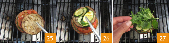 Adicione também uma fatia de berinjela 25 e de abobrinhas 26, depois complete com algumas folhas de rúcula 27.