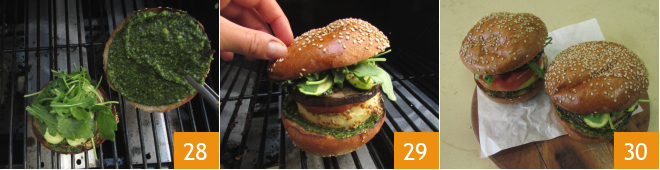 Cubra com a metade superior do pão espalhada com pesto 28 e pressione levemente 29. Monte o segundo sanduíche da mesma maneira e desfrute imediatamente do seu tomino no churrasco com vegetais grelhados e mostarda 30!