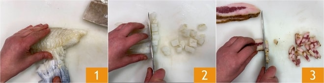 Para preparar os tonnarelli alla gricia com bacalhau, primeiro remova a pele do bacalhau já dessalgado 1 e quaisquer espinhas, depois corte a polpa em cubos 2. Remova a pele do guanciale e corte-o em tiras 3.