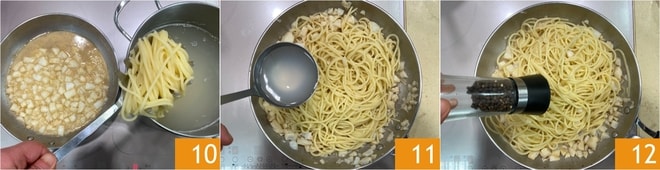Escorra os tonnarelli na frigideira com o bacalhau 10, adicione uma concha de água do cozimento 11, apimente 12 e misture tudo em fogo alto.
