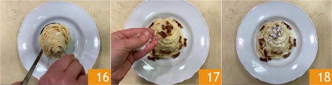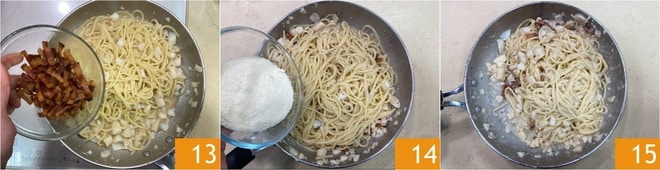 Neste ponto, desligue o fogo e adicione quase todo o guanciale crocante 13 e quase todo o pecorino ralado 14. Adicione o queijo aos poucos e misture bem o tempero até obter uma consistência cremosa 15, adicionando, se necessário, um pouco mais de água do cozimento.