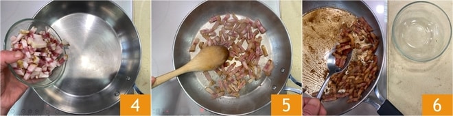 Coloque o guanciale em uma frigideira bem quente sem adicionar gordura 4 e frite em fogo médio-alto, mexendo frequentemente 5. Quando o guanciale estiver crocante e dourado, transfira-o para uma tigela, deixando o fundo de cozimento na frigideira 6.