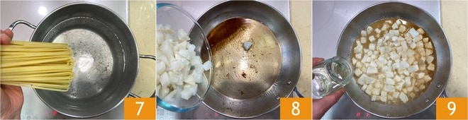 Enquanto isso, leve uma panela com água não salgada para ferver e cozinhe os tonnarelli al dente 7. Enquanto isso, coloque o bacalhau na frigideira onde você cozinhou o guanciale 8 e refogue por alguns minutos, adicionando o vinho branco 9.