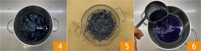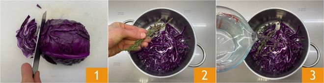 Para preparar o atum selado com ratatouille invernal, primeiro dedique-se ao repolho roxo: corte o repolho em julienne 1 e transfira para uma panela. Adicione o tomilho 2 e cubra com água 3.